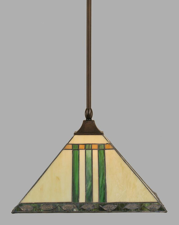 Stem Hung Pendant With Square Fitter Shown In Bronze Finish With 14" Green & Metal Leaf Tiffany Glass
